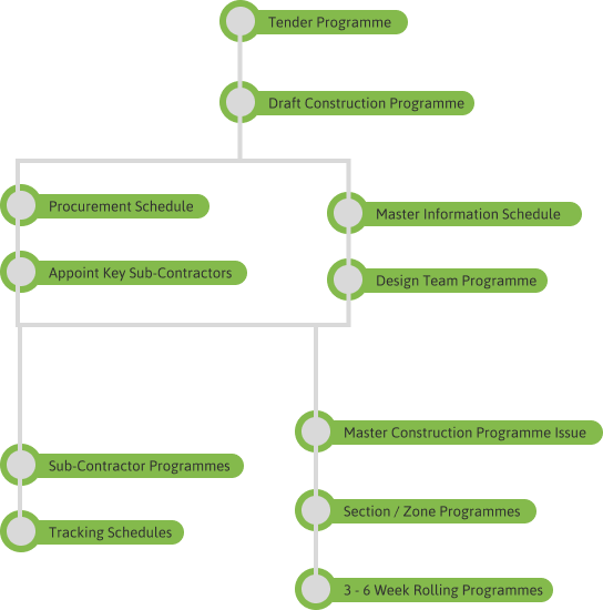 The master programme will be prepared prior to the commencement of works, featuring 3-month and 4-week look-ahead progress reports to ensure timely updates. A detailed design programme will be established for all disciplines, fully integrating with specialist subcontractors to facilitate collaboration. Additionally, a master procurement schedule will be created, encompassing both subcontractors and suppliers. To support effective tracking, we will utilize schedules, phasing diagrams, and 3D modeling. Regular programme review workshops will be conducted to facilitate ongoing assessment and adjustments, ensuring continuous progress monitoring against the baseline. Furthermore, independent monthly audits will be performed, followed by team reviews to maintain accountability and drive project success.